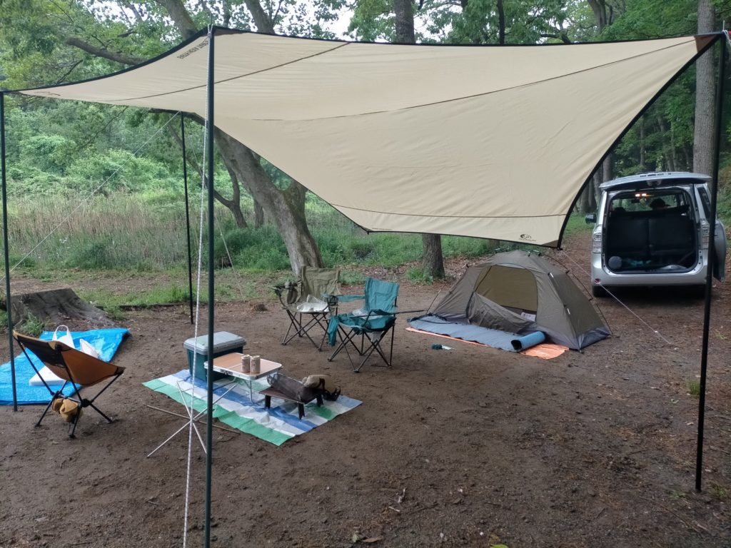 今回の宿泊に必要なタープとテント2張りを設営。 ワークマンで購入したテントとコールマンのツーリングドームSTを設営します。タープはまだまだ一人では張れそうな気がしない。