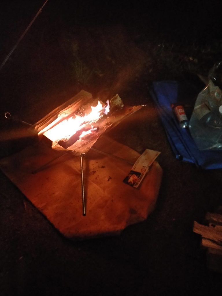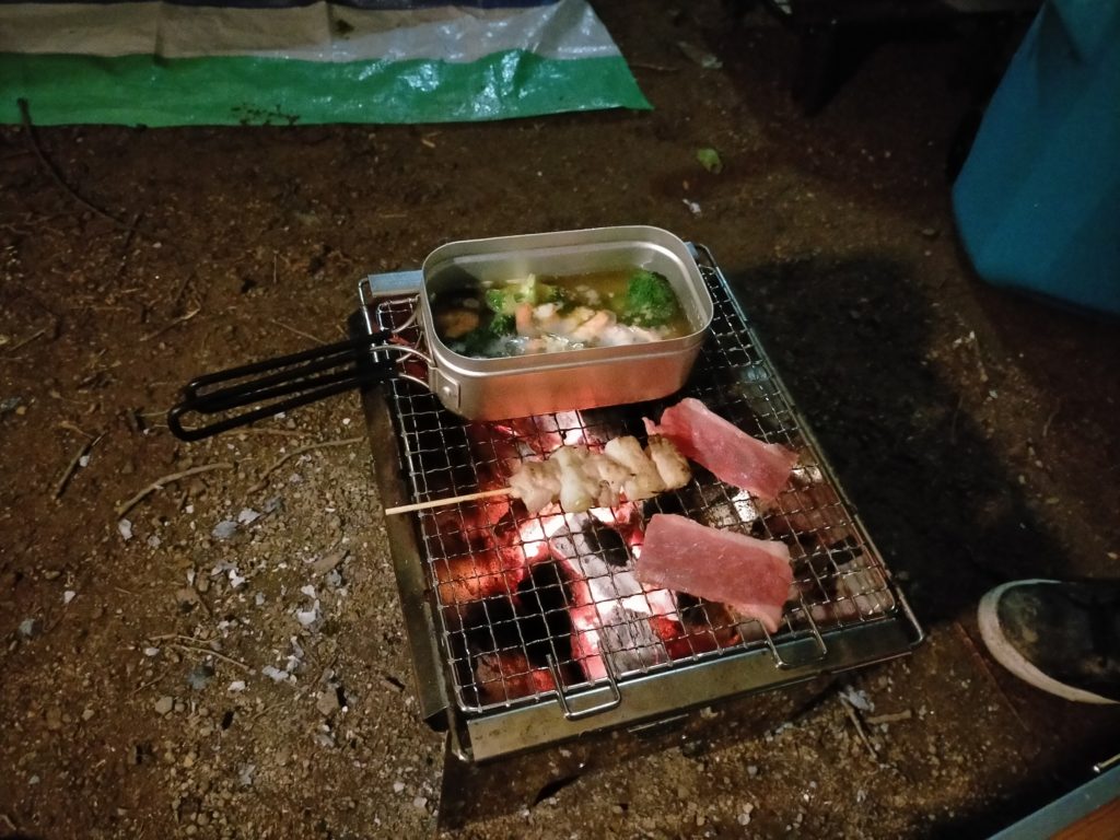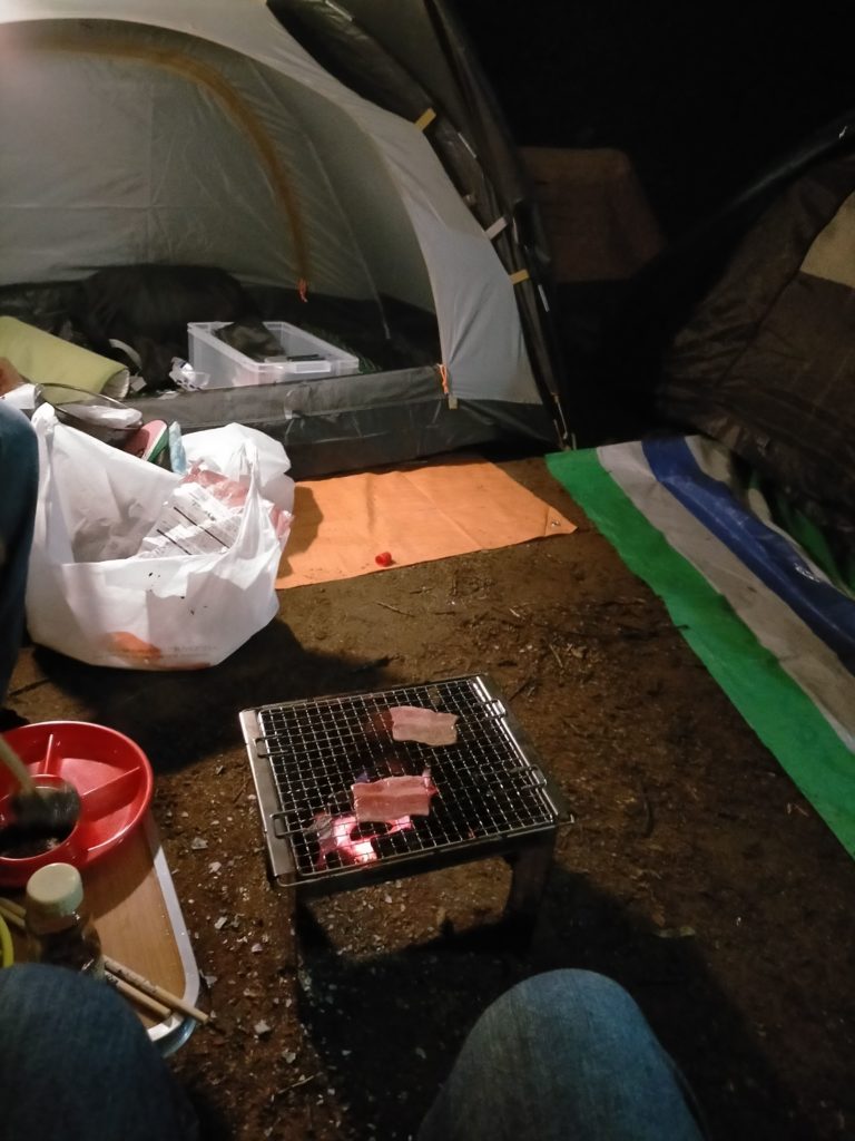 テントも無事設営し夕食。アヒージョと焼き肉を炭火で焼き、焚火で暖をとります。