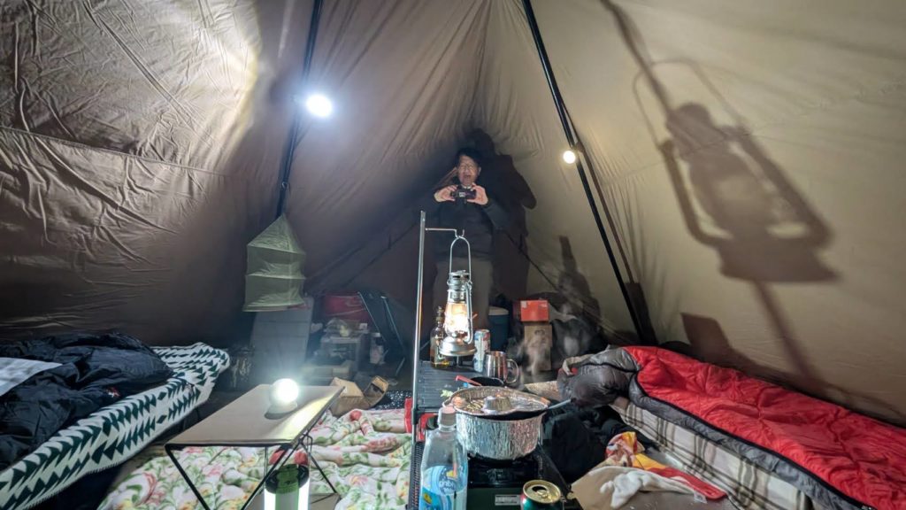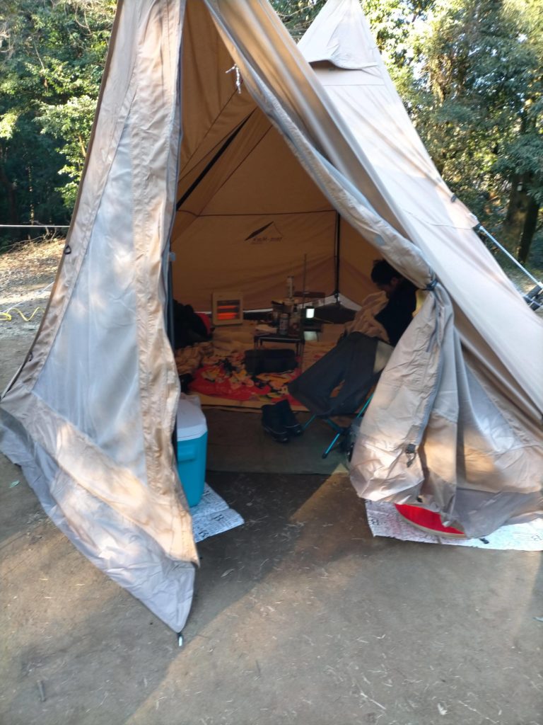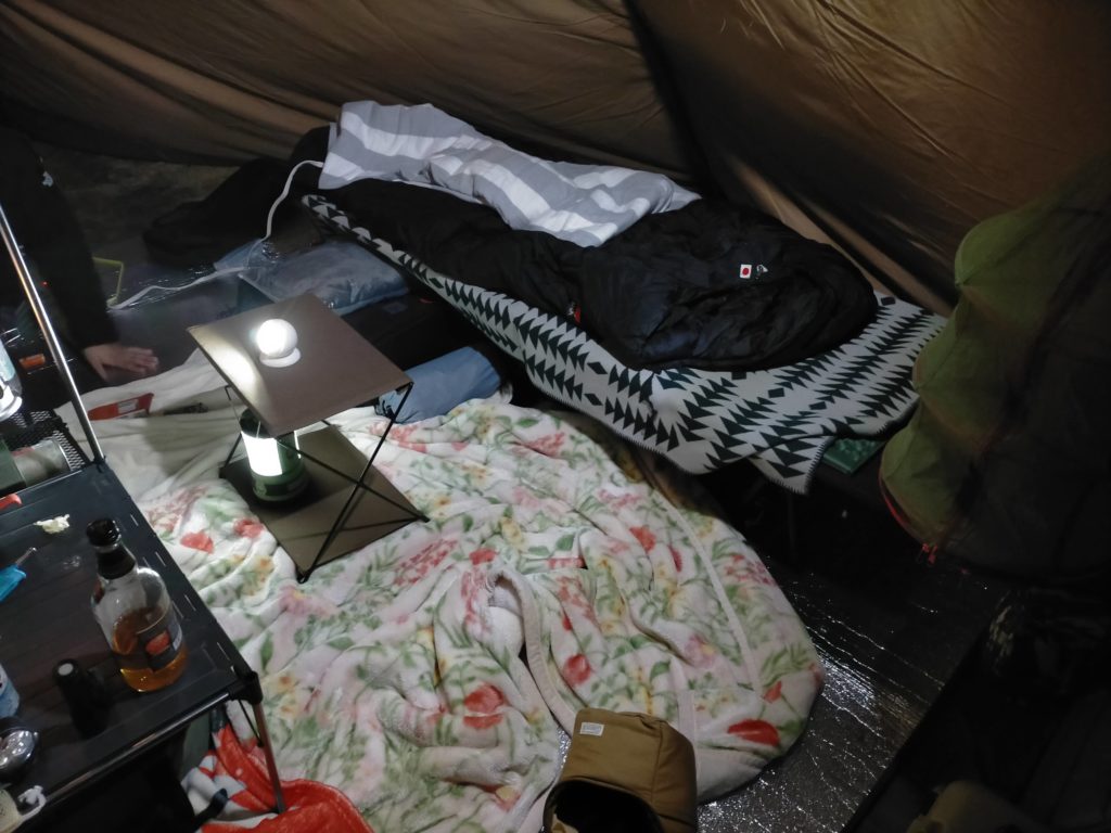地べたはインナーマットのでかいやつと自宅から持参した毛布。 電気マットもそのうち購入するかな。