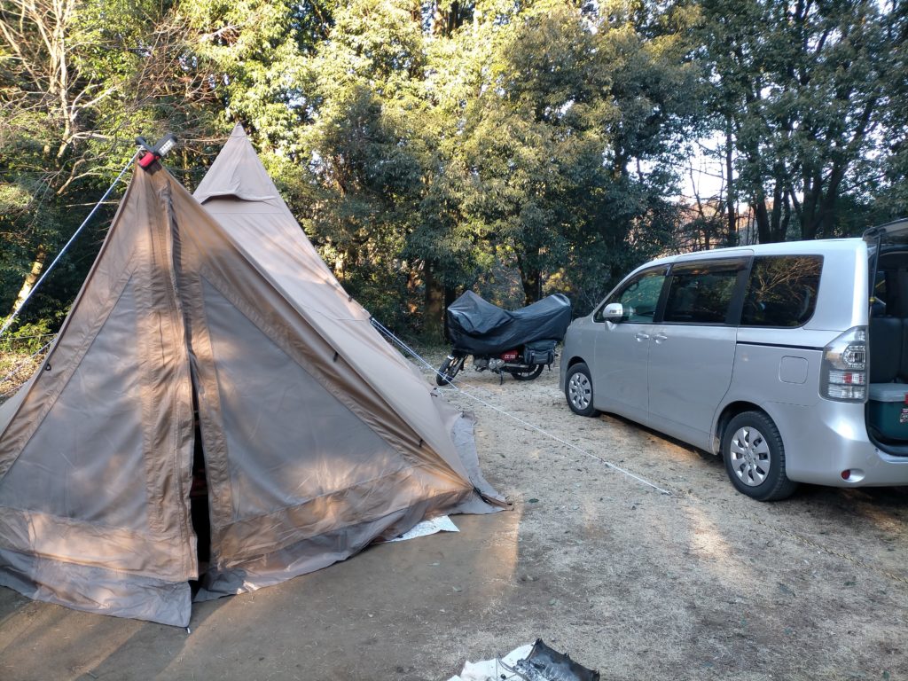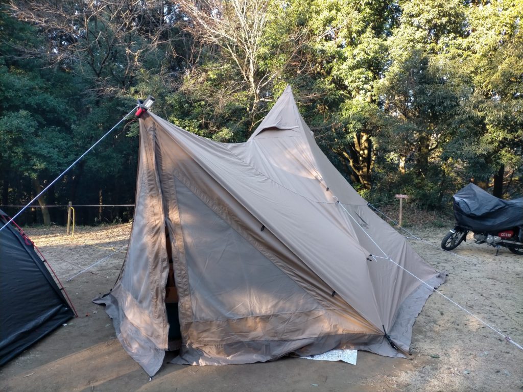 柏から直行した私が先に到着。今回、サーカステント コンフォートMIDとトリポットを購入したので試し張りの予定で来ましたが、本当に建てられるか不安いっぱい。 一応、先にTomountのドームテントを組み立ててました。息子が来たので一緒に建てるも、なかなかムズイ。(笑い)