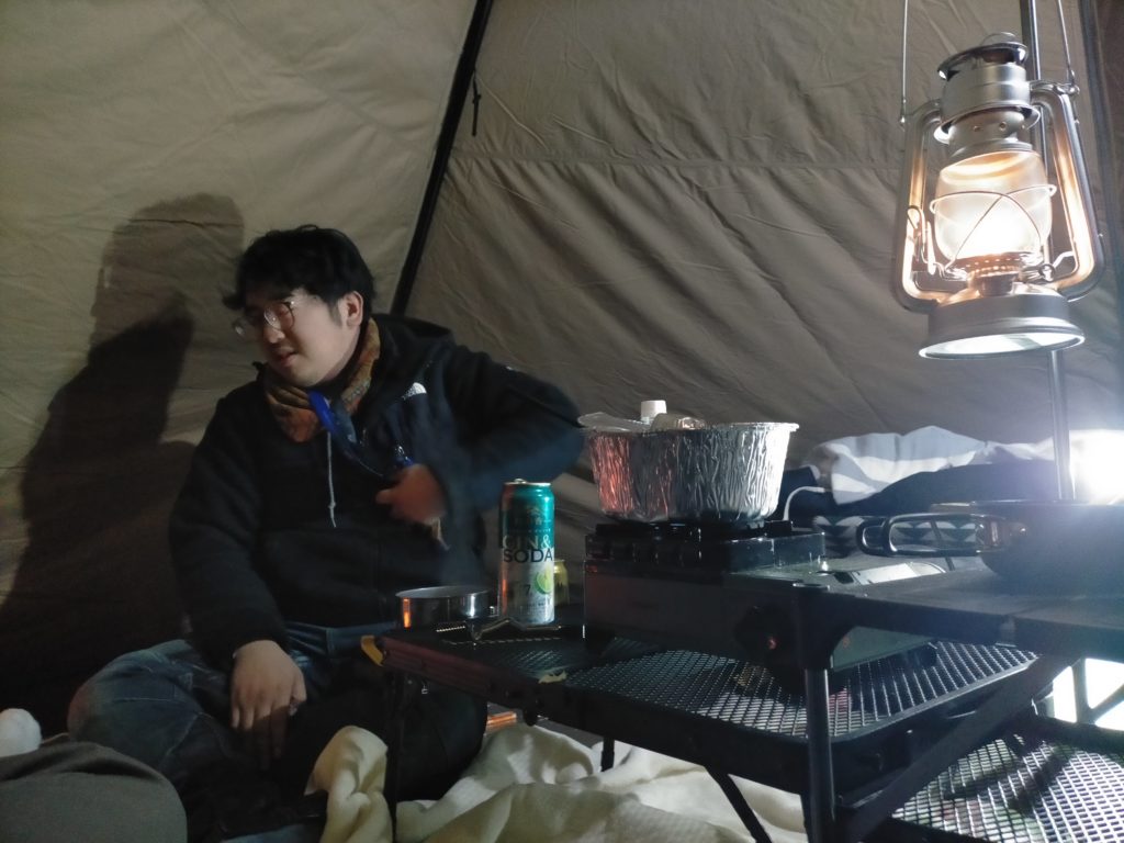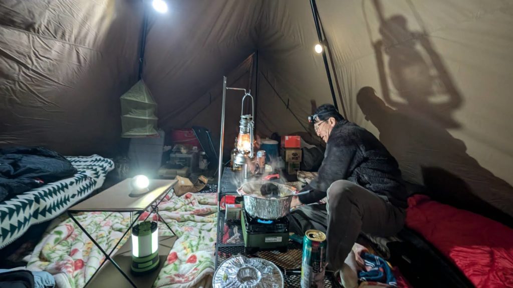 薪ストーブや石油ストーブはチトハードルが高いのでオール電化 (#^.^#)。 テント内でガスコンロのタフマルJr君は使いましたので、一応一酸化チェッカーも発動。 テント内でお鍋を少し温める程度で利用しました。 あとはお酒が進む進む。