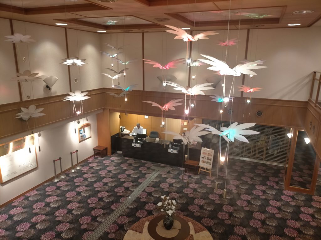 2階食堂から1階ロビーを望む。