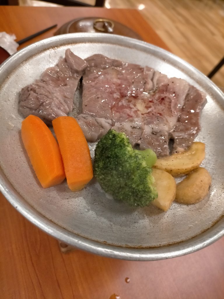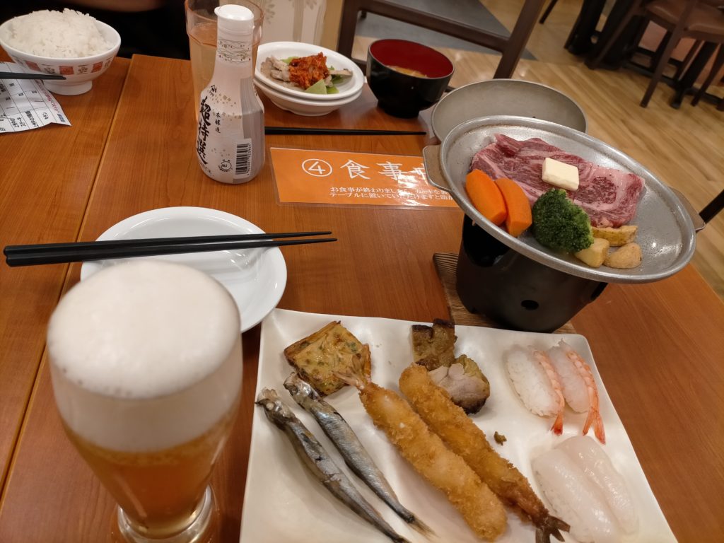 明日の旅程をなんとなく決めて、ひとっ風呂浴びて夕飯に。部屋まで行くエレベーターにオプション料理の追加が可能でしたので、奮発して上州牛サーロインと牛タンを追加オーダーで予約。たまにはいいでしょ。伊東園ホテルはバイキングと飲み放題付きなので非常にリーズナブルです。